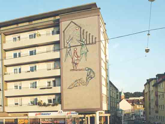 zurück die Mosaiken für die Baugenossenschaft Arlinger stammen von Willi Zanger,dieses ist in der Östlichen, Ecke Altstädterstr.und wurde unter der Mithilfe von Maler Appenzeller ausgeführtGlasmosaik mit Keramik zurück